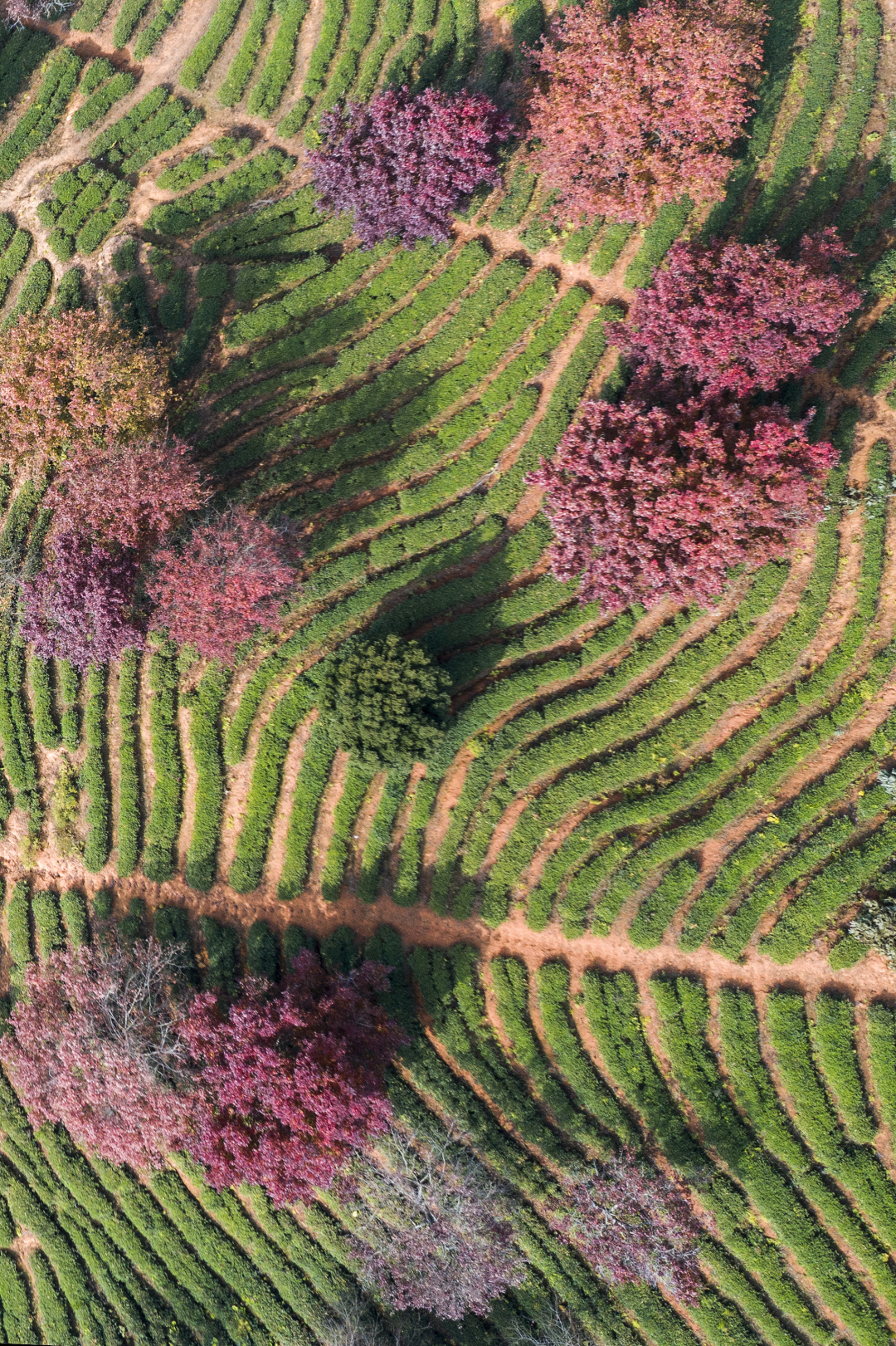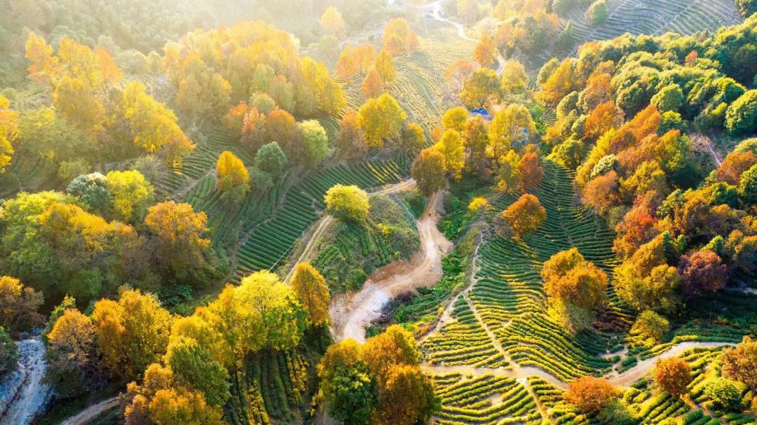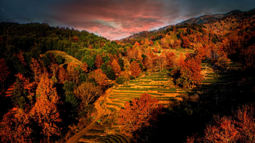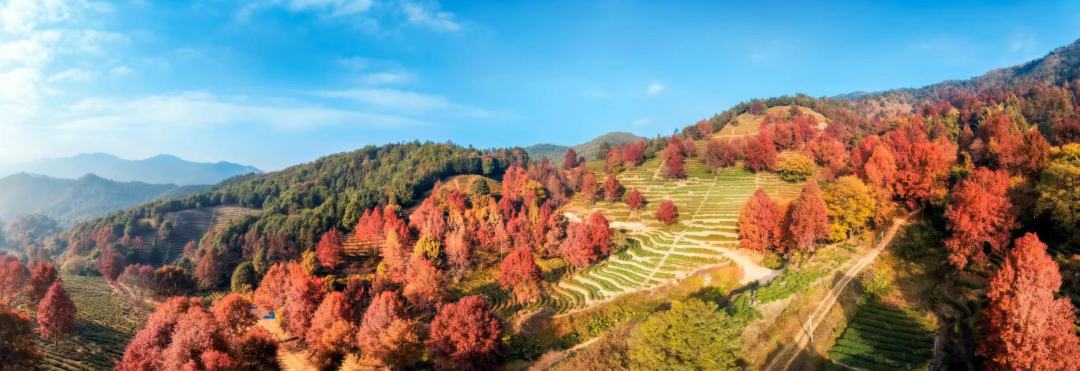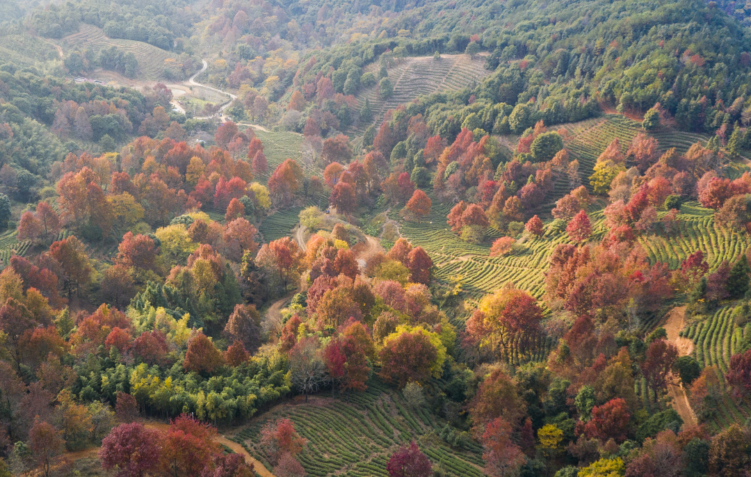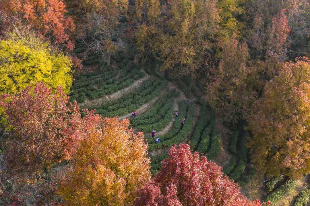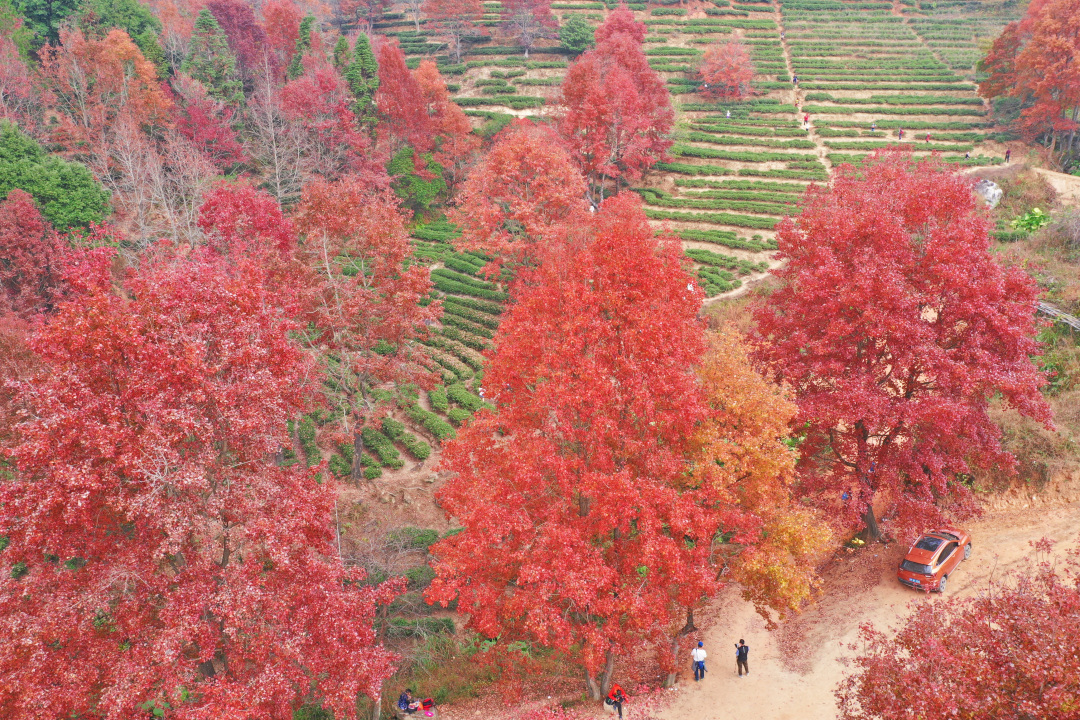红枫错落于茶田,红绿相间