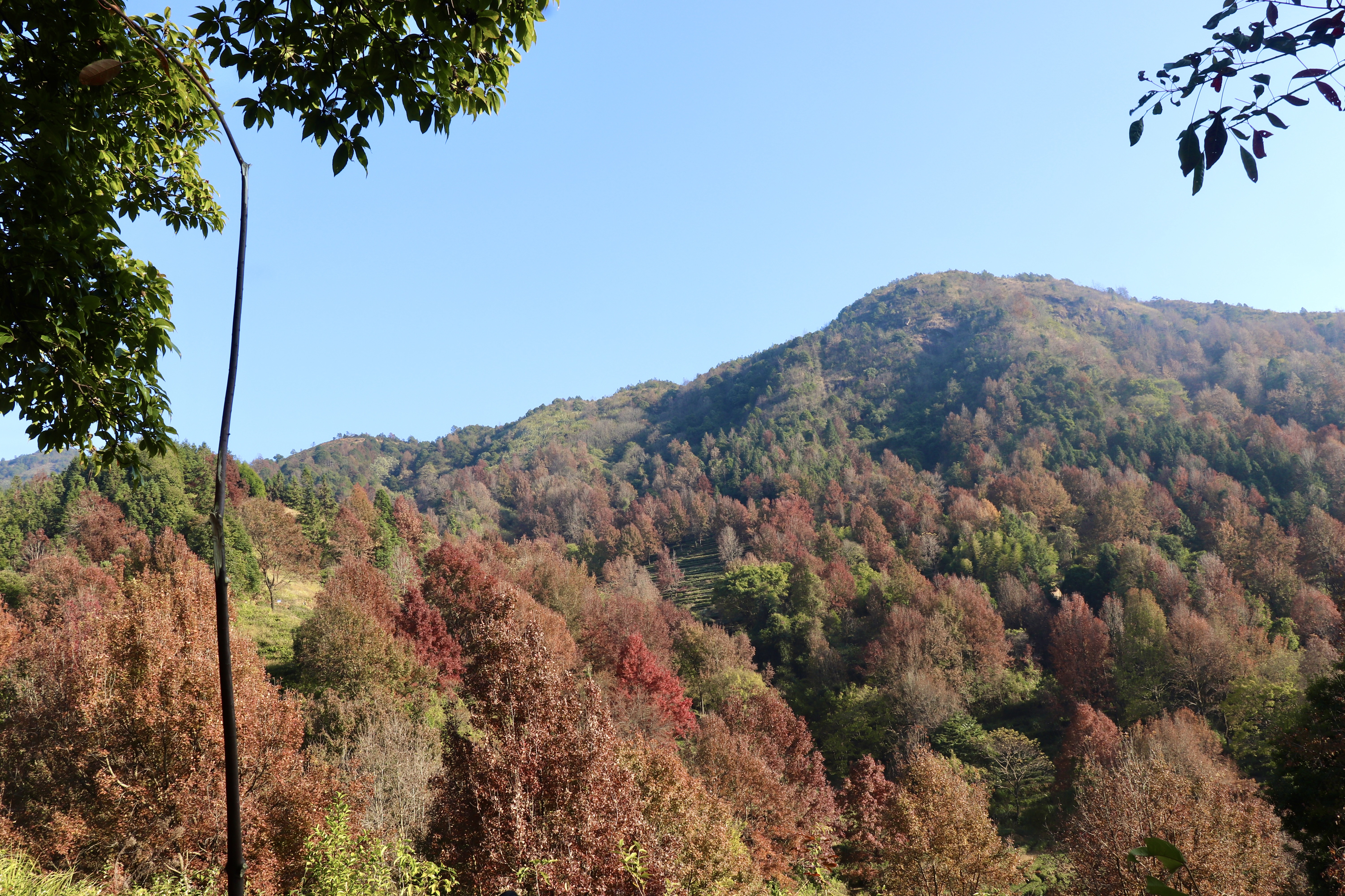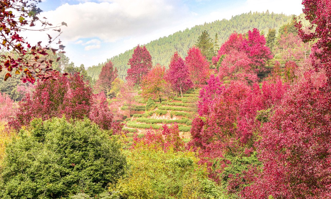 上百颗枫树点缀在半山茶园之间