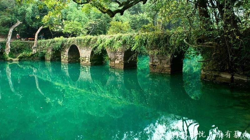 景区北首有一座建于道光十五年(1836年)的小七孔古桥,景区由此得名。这是一座小巧玲珑的七孔古石桥,桥长25米,桥面宽4米,拱高4米,昔为沟通荔波至广西的重要桥梁。桥由麻石条砌成,桥身爬满藤蔓和蕨类;两岸古木参天,波影千顷;桥下涵碧潭绿波荡漾,游鱼成群。
